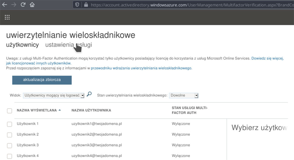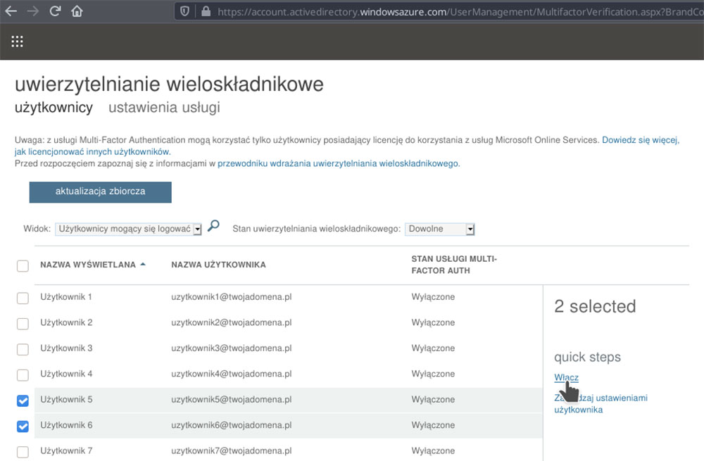 After running the multi-factor authentication mechanism for one or more users select them from the list – afterwards, an Enable button should appear at the right side of the screen. After turning this option on, when a user is logging into one of the components of Office 365, a request for additional information will automatically pop up in the browser, followed by the configuration creator.