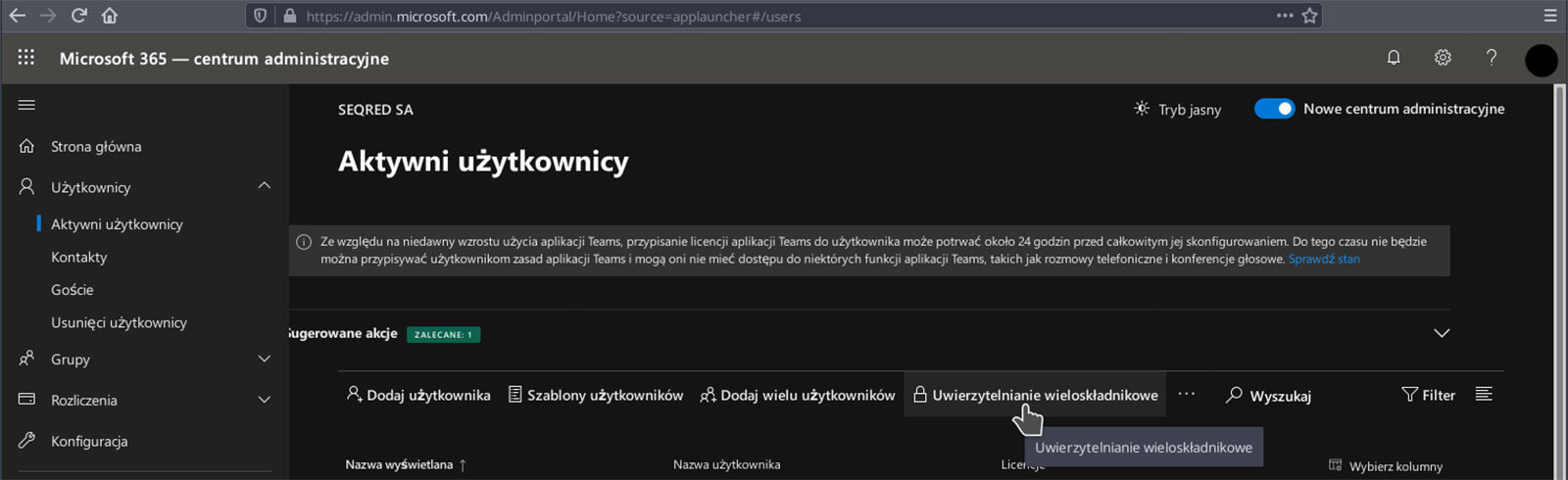 2. Choose „Users" in the menu and click on „Active users". When a list of registered users pops up, choose “Multi-factor authentication” from the top of the list.