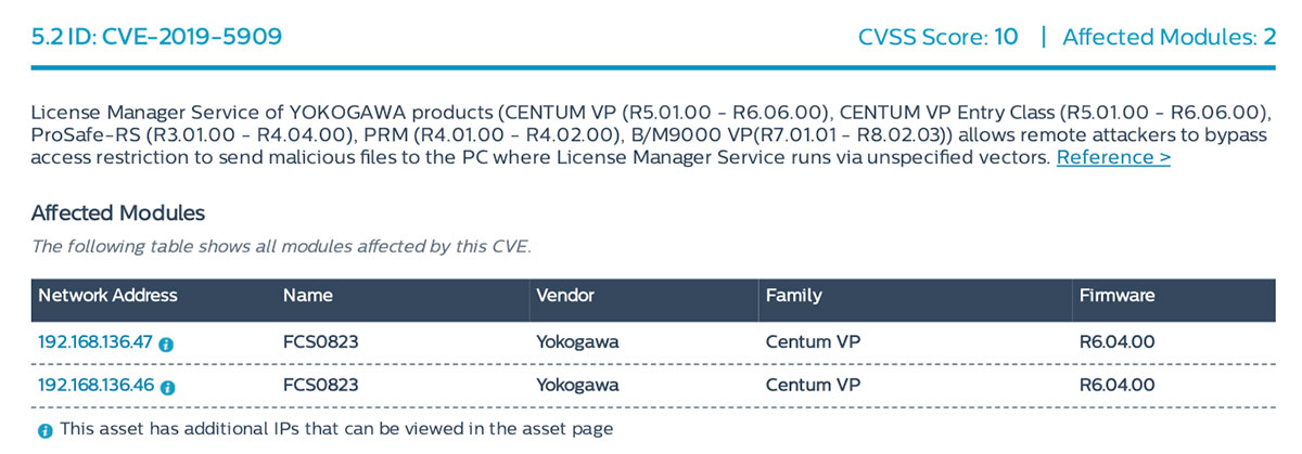 Kolejnym narzędziem jest produkt firmy Tenable (Indegy), znanej z flagowego produktu jakim jest Tenable.SC do zarządzania podatnościami IT. Tenable.OT to rozwiązanie dedykowane dla środowiska OT, wyspecjalizowane jest w znajdowaniu podatności w urządzeniach ICS. W środowisku testowym, omawiane narzędzie dość szybko znalazło podatność systemu DCS. Zidentyfikowana luka bezpieczeństa pozwala zdalnym użytkownikom ominąć uwierzytelnienie i zmodyfikować pliki na stacji roboczej z uprawnieniami systemowymi.